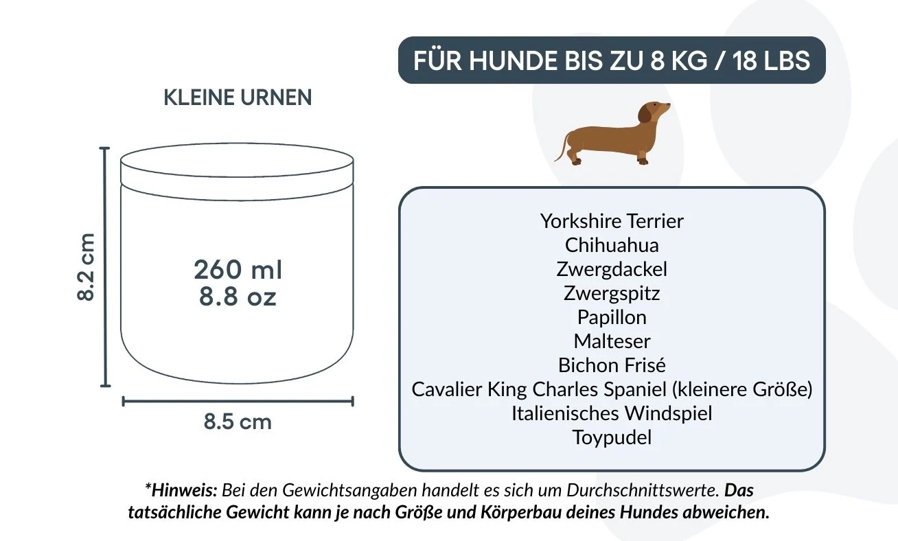 Small: 8.5 cm (W) x 8.2 cm (H) x 8.5 cm (L) | 260ml / 8.8oz |for dogs up to 8kg / 18lbs
