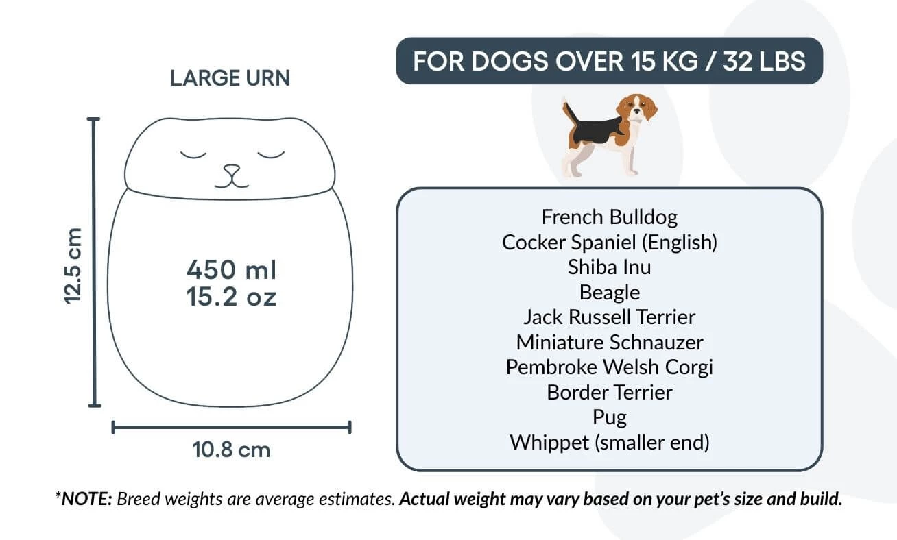 This ceramic dog urn offers a peaceful place for ashes while honouring your dog’s memory with elegance. It’s the perfect personalised pet urn to cherish their legacy with dignity and love.