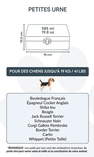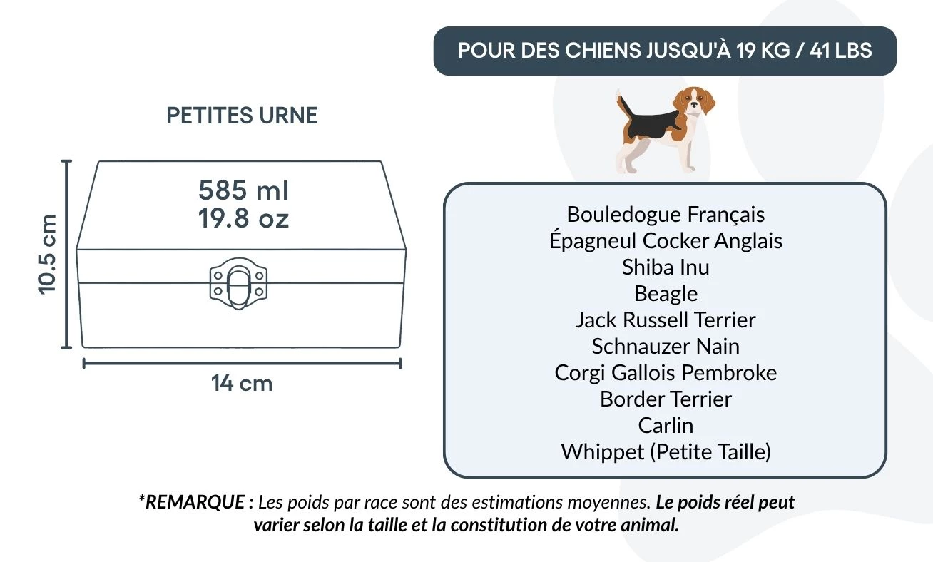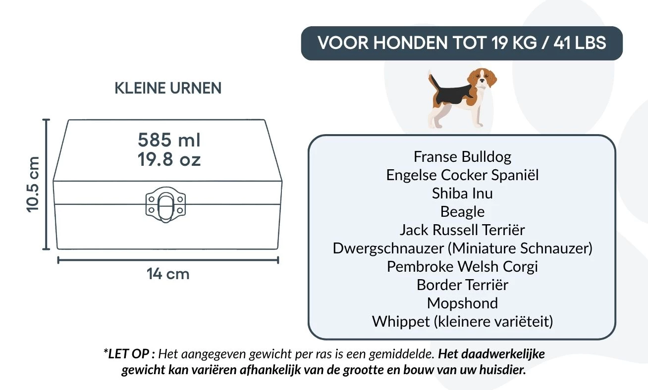 Size / Urn Capacity: 14 cm (W) x 10.5 cm (H) x 6.5 cm (L) | ~585 ml / 35.7 cubic inches / 19.8 oz | for dogs up to 19 kg / 41 lbs