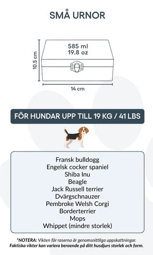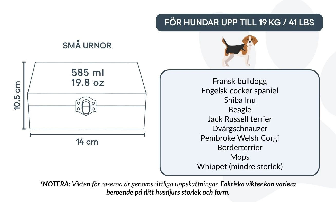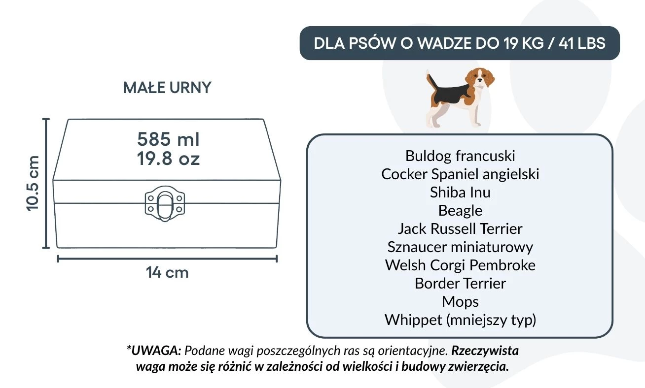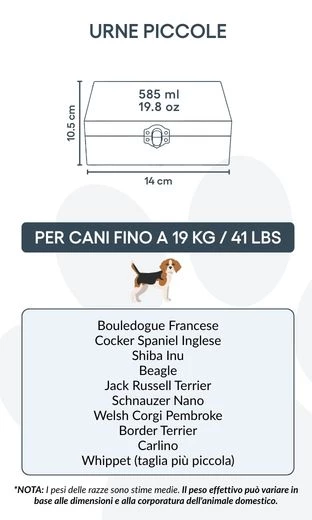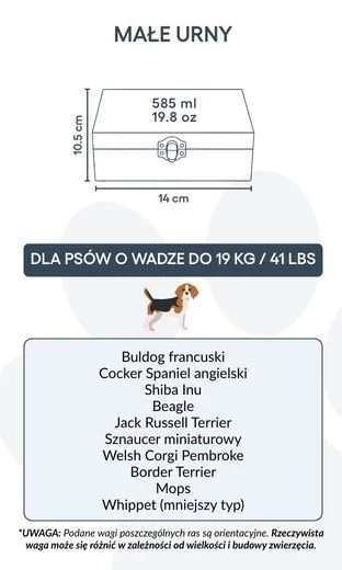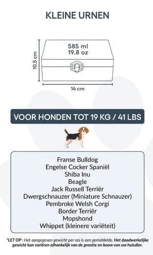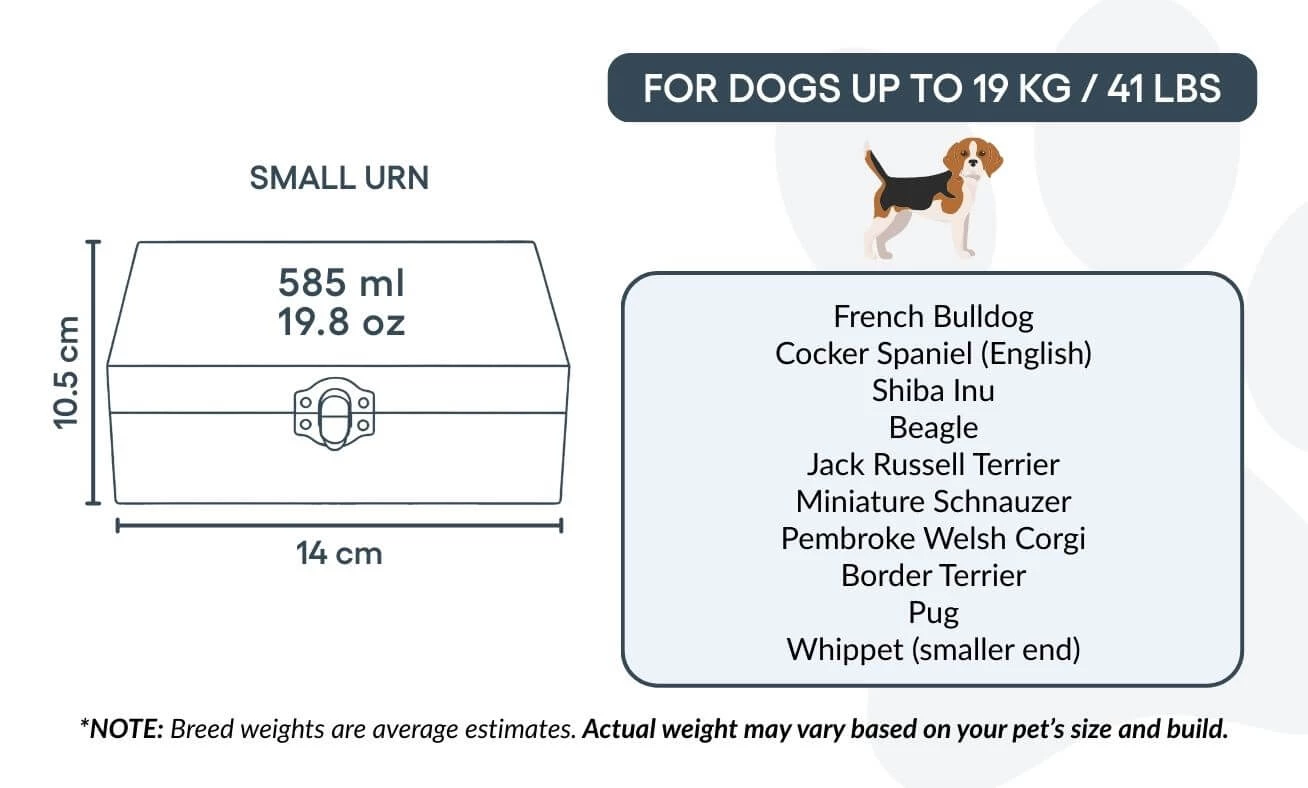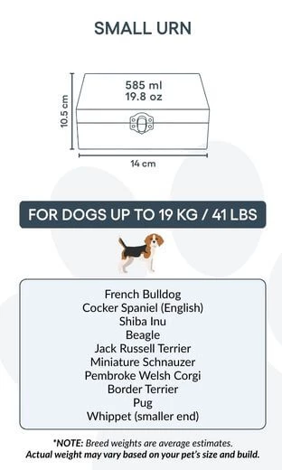 Size / Urn Capacity: 14 cm (W) x 10.5 cm (H) x 6.5 cm (L) | ~585 ml / 35.7 cubic inches / 19.8 oz | for dogs up to 19 kg / 41 lbs