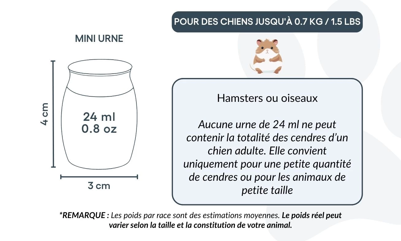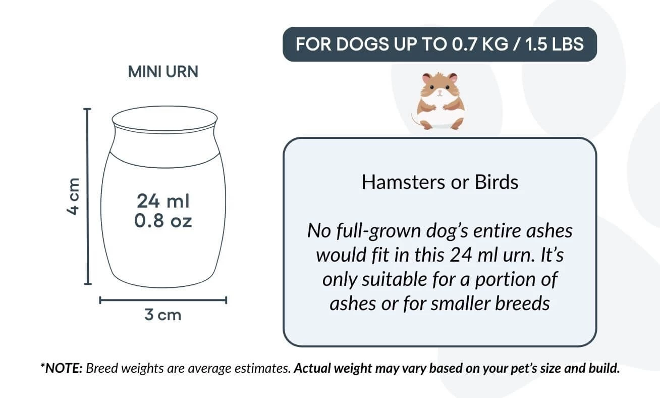 Available in silver, gold, and rose gold, the urn’s compact size makes it ideal for small pets such as hamsters or birds—or for keeping part of the ashes of larger dogs. It’s a versatile and tender way to celebrate a loyal companion’s life, keeping them close even after they’ve gone. For those who wish to preserve only a portion of their beloved dog’s ashes—whether for sharing with family, creating multiple keepsakes, or combining with other memorials—this urn can also be a meaningful choice for larger dogs. It allows you to keep a part of them close, in a way that feels right for you.