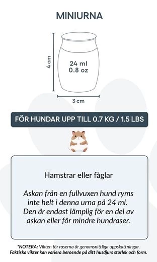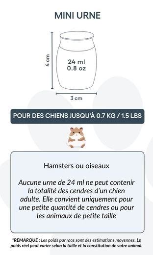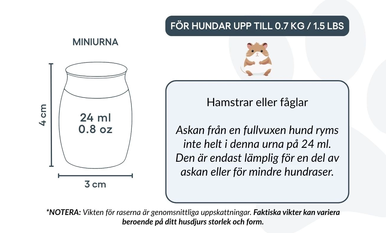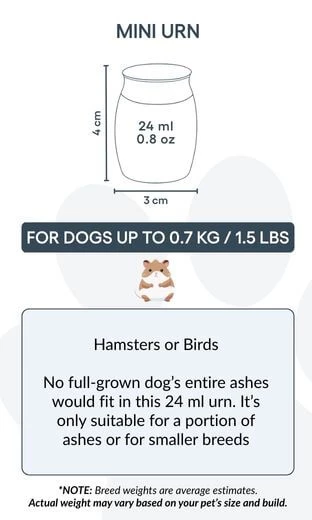 Available in silver, gold, and rose gold, the urn’s compact size makes it ideal for small pets such as hamsters or birds—or for keeping part of the ashes of larger dogs. It’s a versatile and tender way to celebrate a loyal companion’s life, keeping them close even after they’ve gone. For those who wish to preserve only a portion of their beloved dog’s ashes—whether for sharing with family, creating multiple keepsakes, or combining with other memorials—this urn can also be a meaningful choice for larger dogs. It allows you to keep a part of them close, in a way that feels right for you.