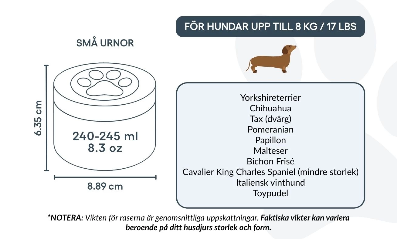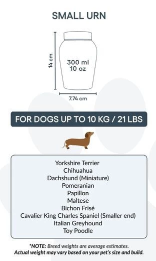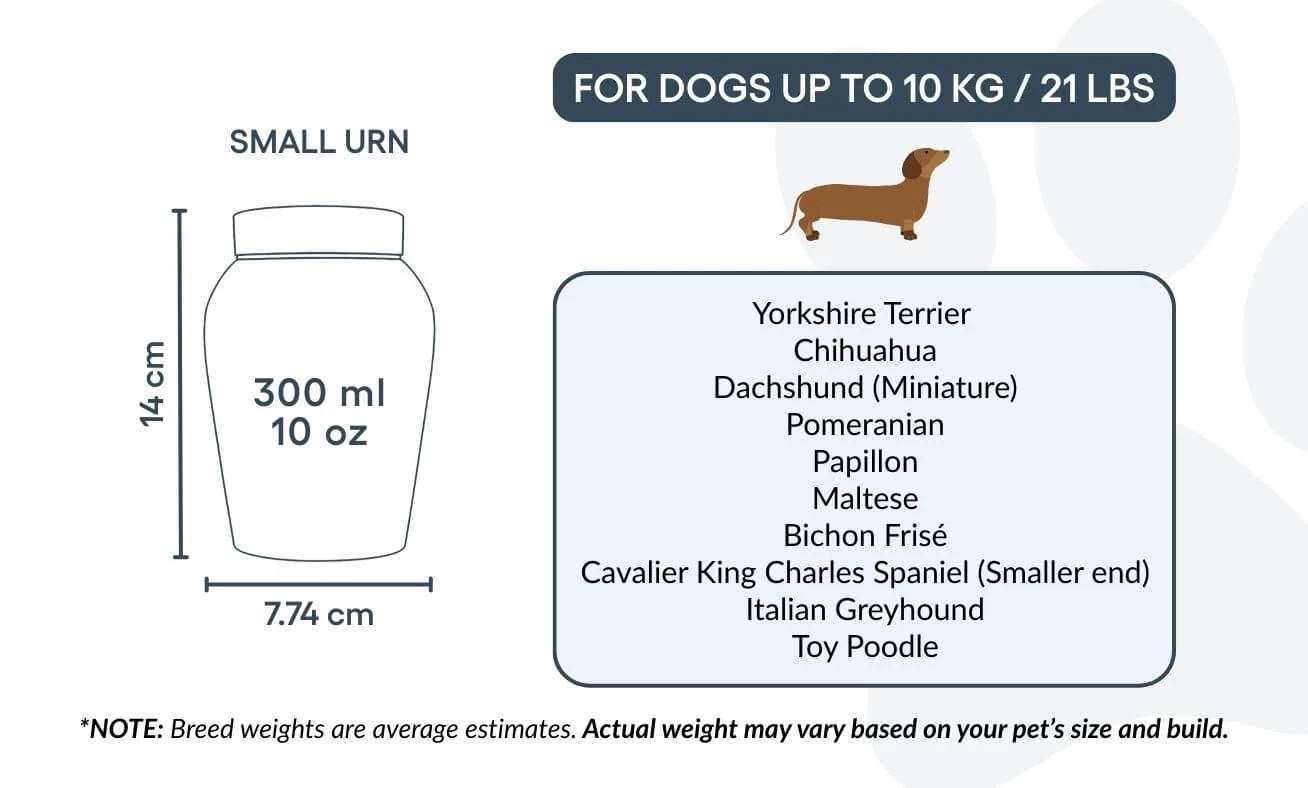 Ideal for pet cremation and dog ashes, this memorial urn is available in two sizes to accommodate small to large-sized dogs. With a secure closure and custom design, it serves as both a protective casket and a comforting symbol of your pet’s place in your heart.